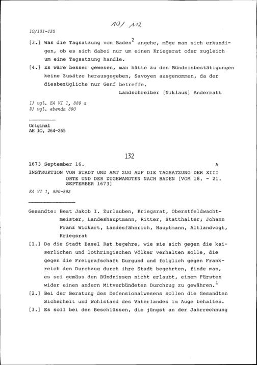 Instruktion von Stadt und Amt Zug für die von Uri einberufene Konferenz in Luzern