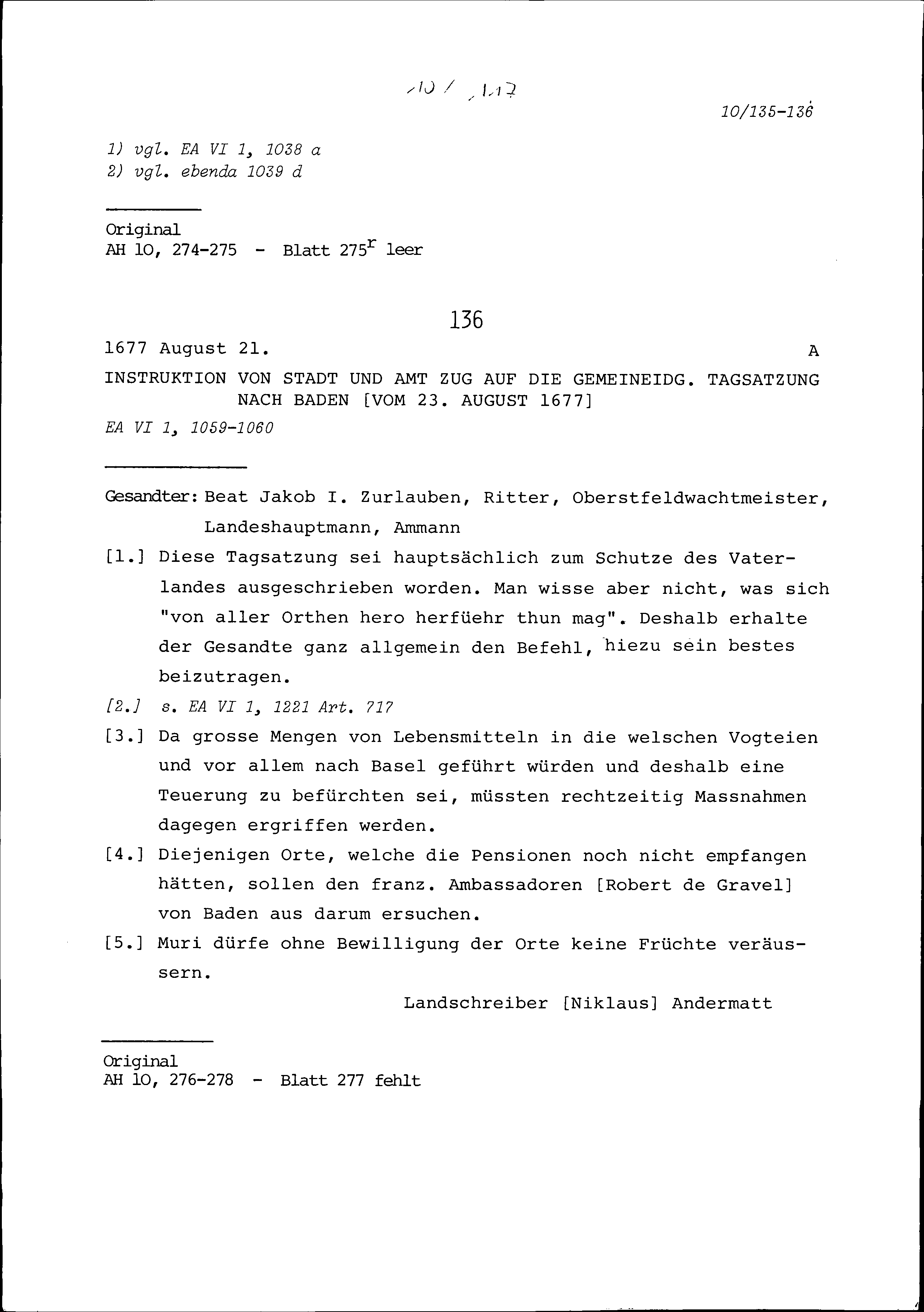 Instruktion von Stadt und Amt Zug sowie der Landsgemeinde auf die Tagsatzung in Baden vom 23. Februar 1677