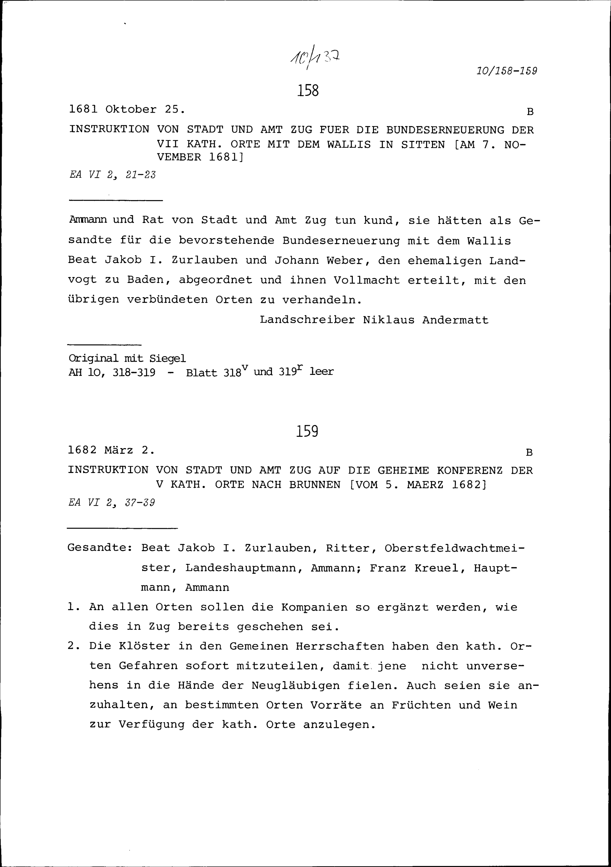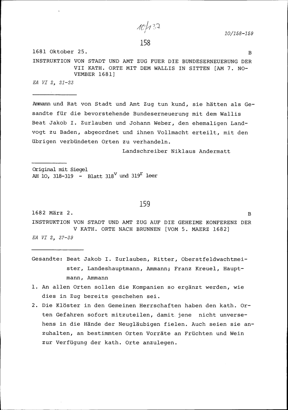 Instruktion von Stadt und Amt Zug auf die geheime Konferenz der Fünf Katholischen Orte in Brunnen vom 5. März 1682