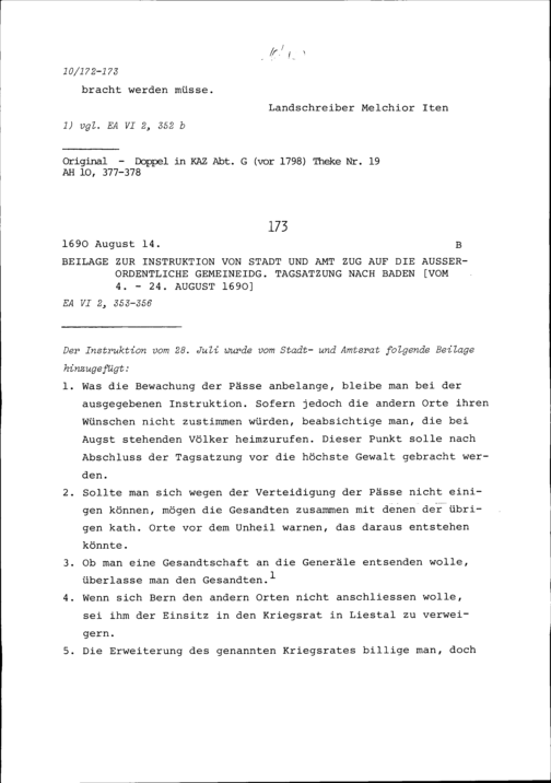 Instruktion von Stadt und Amt Zug auf die Konferenz aller Katholischen Orte in Luzern vom 31. Juli bis 1. August und die ausserordentliche Tagsatzung in Baden vom 4. bis 24. August 1690