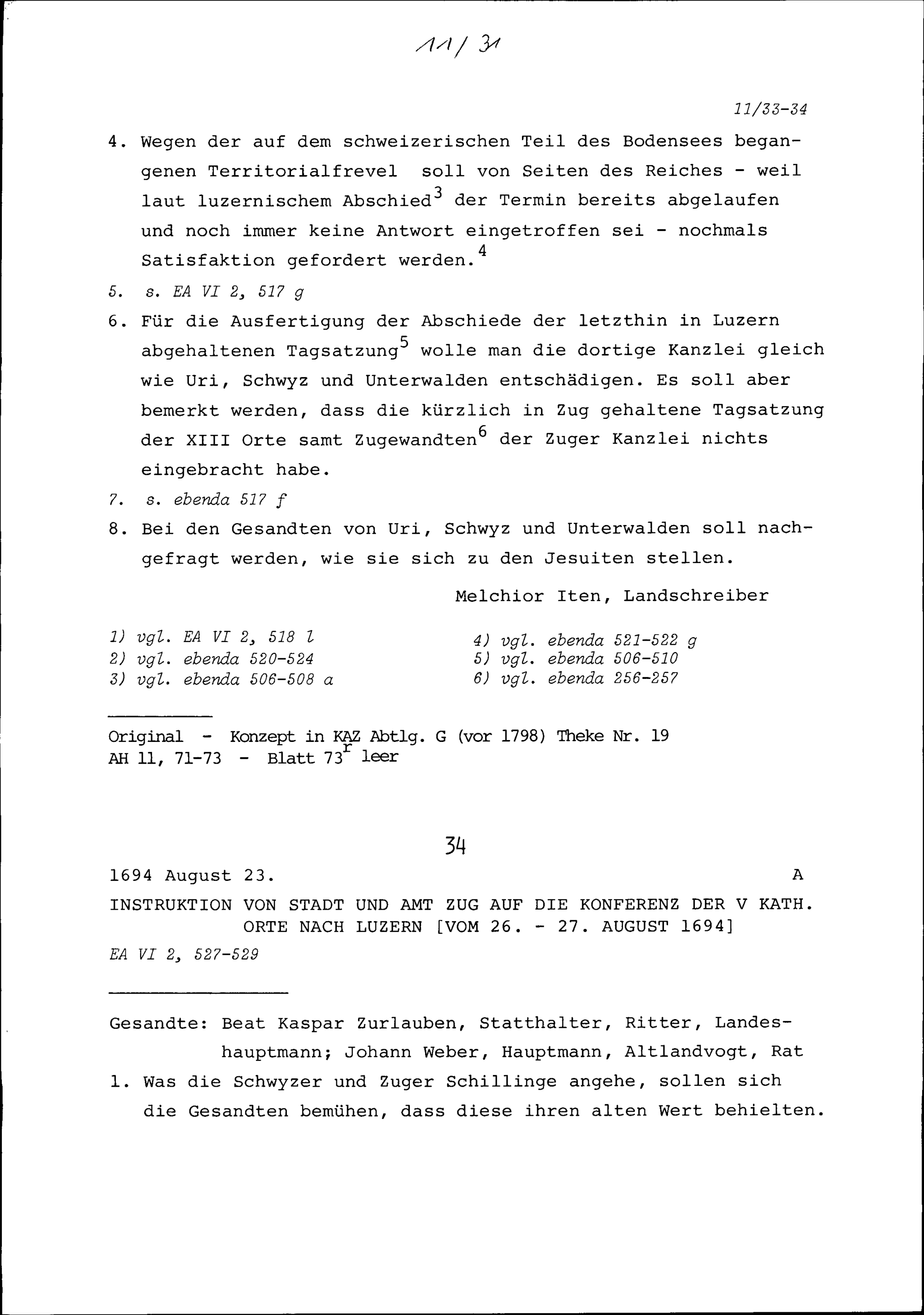 Instruktion von Stadt und Amt Zug auf die Konferenz der mit Mailand verbündeten Orte sowie des Abtes von Sankt Gallen in Luzern vom 5. bis 6. Mai 1694