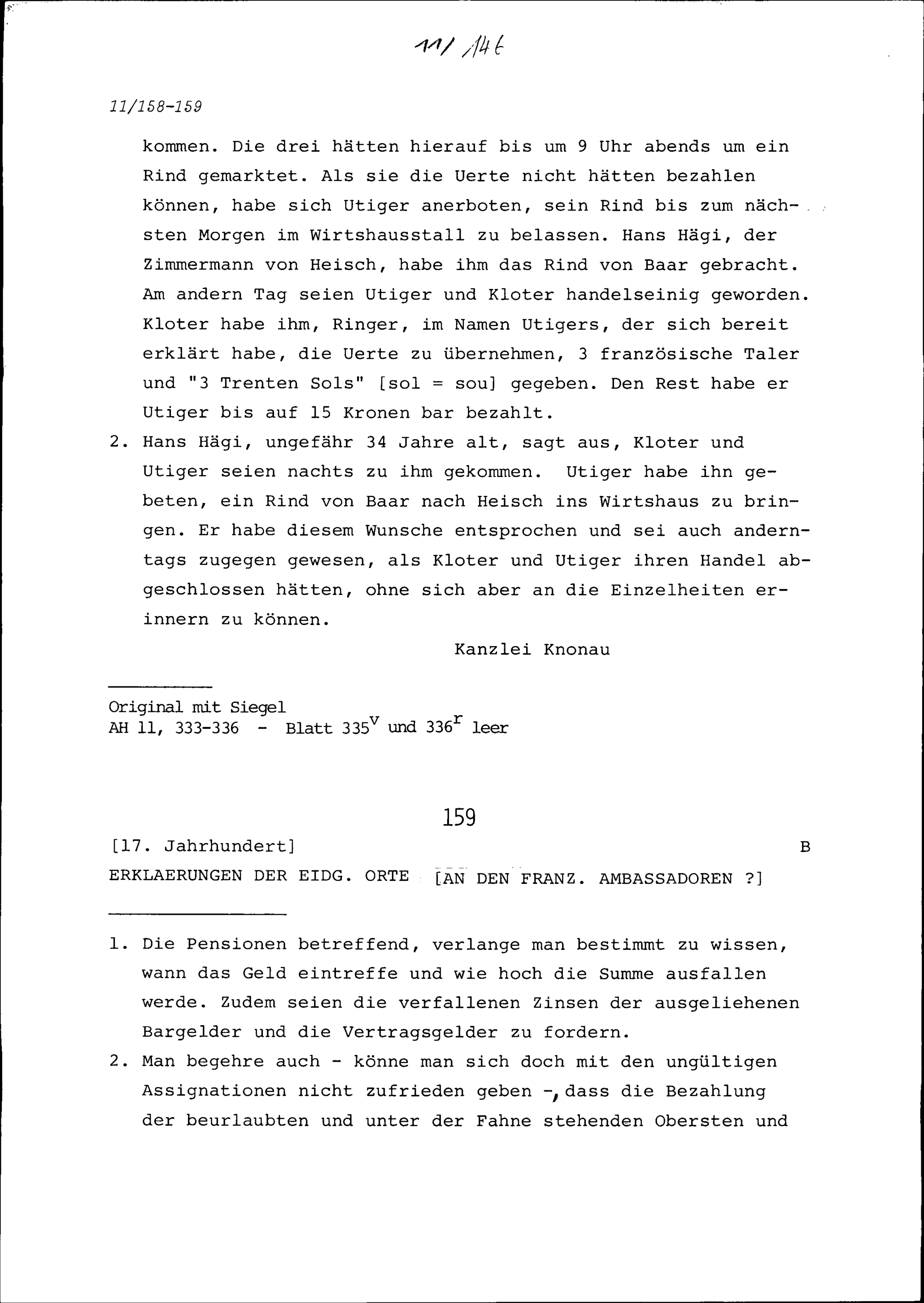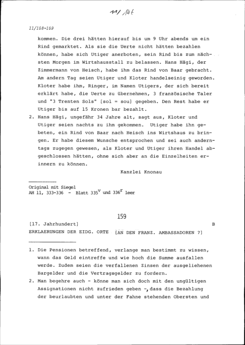 Zeugenaussagen über einen Viehhandel zwischen Beat Jakob Utiger von Baar und Balz Kloter auf dem Schnabelberg