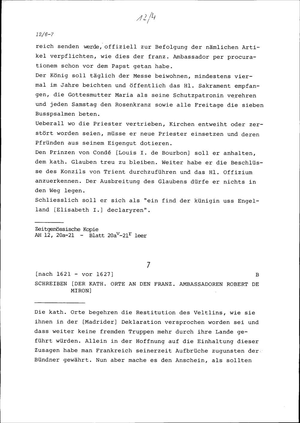 Bedingungen, die Clemens VIII., Papst, an einen Übertritt von Heinrich IV., König von Frankreich, zum katholischen Glauben knüpft