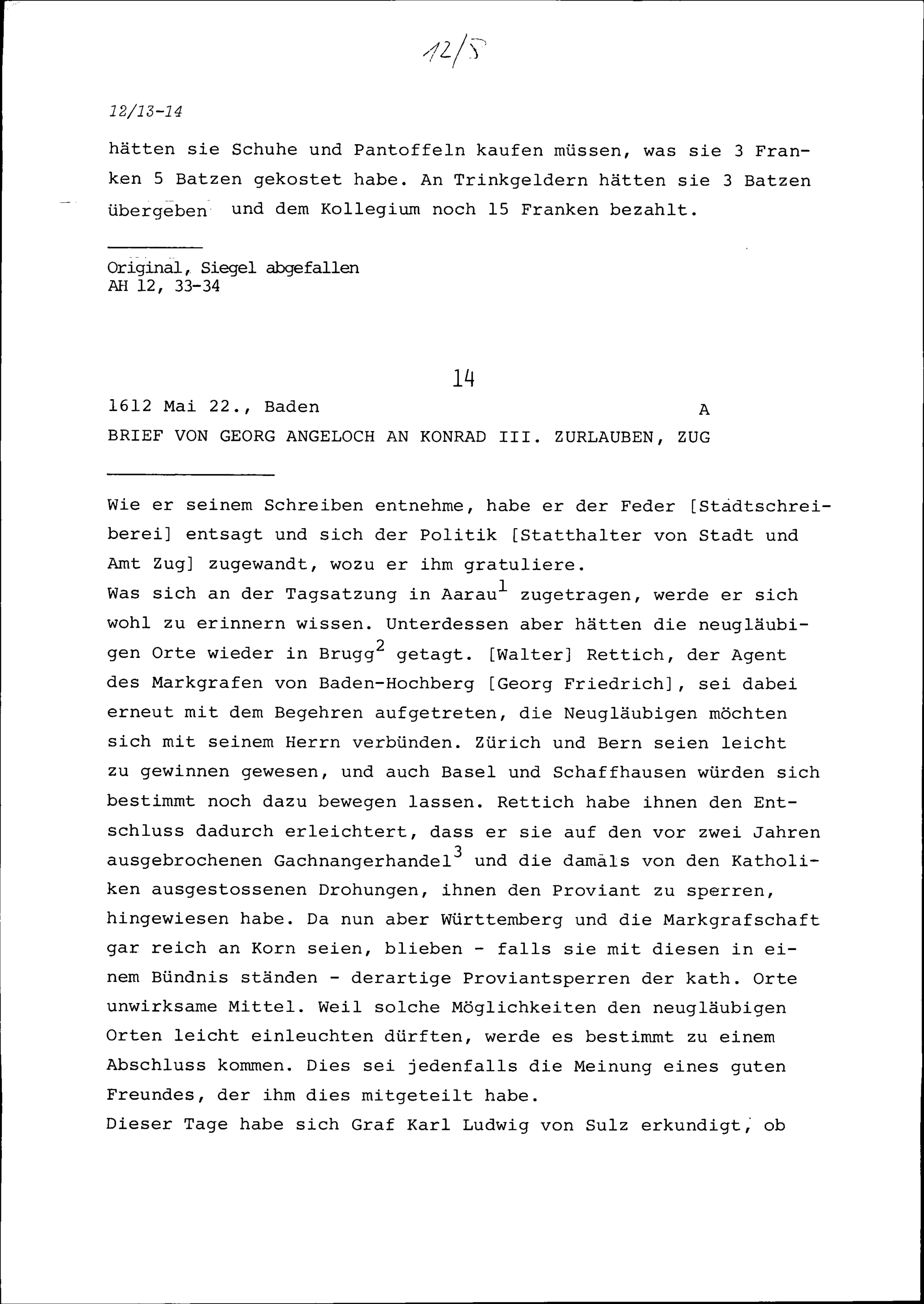 Schreiben von Beat II. Zurlauben an Konrad III. Zurlauben, Zug