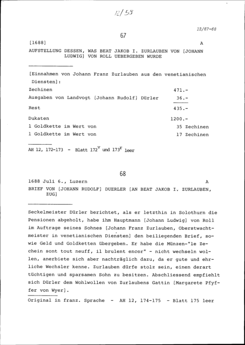 Schreiben von Johann Rudolf Dürler an Beat Jakob I. Zurlauben, Zug