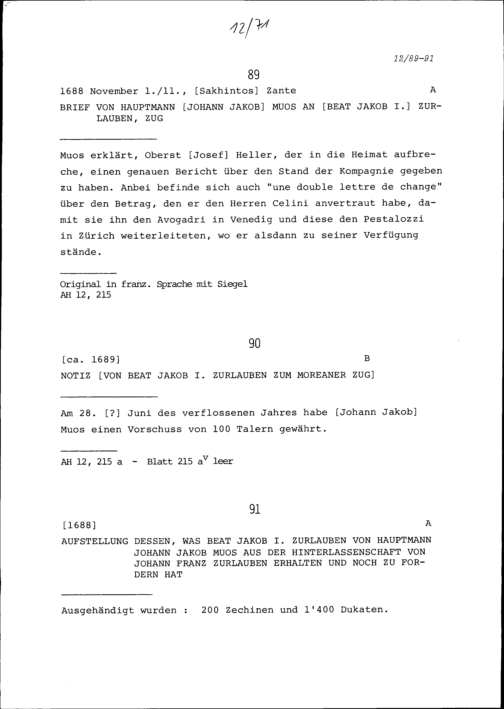 Aufstellung dessen, was Beat Jakob I. Zurlauben von Johann Jakob Muos, Hauptmann, aus der Hinterlassenschaft von Johann Franz Zurlauben erhalten und noch zu fordern hat