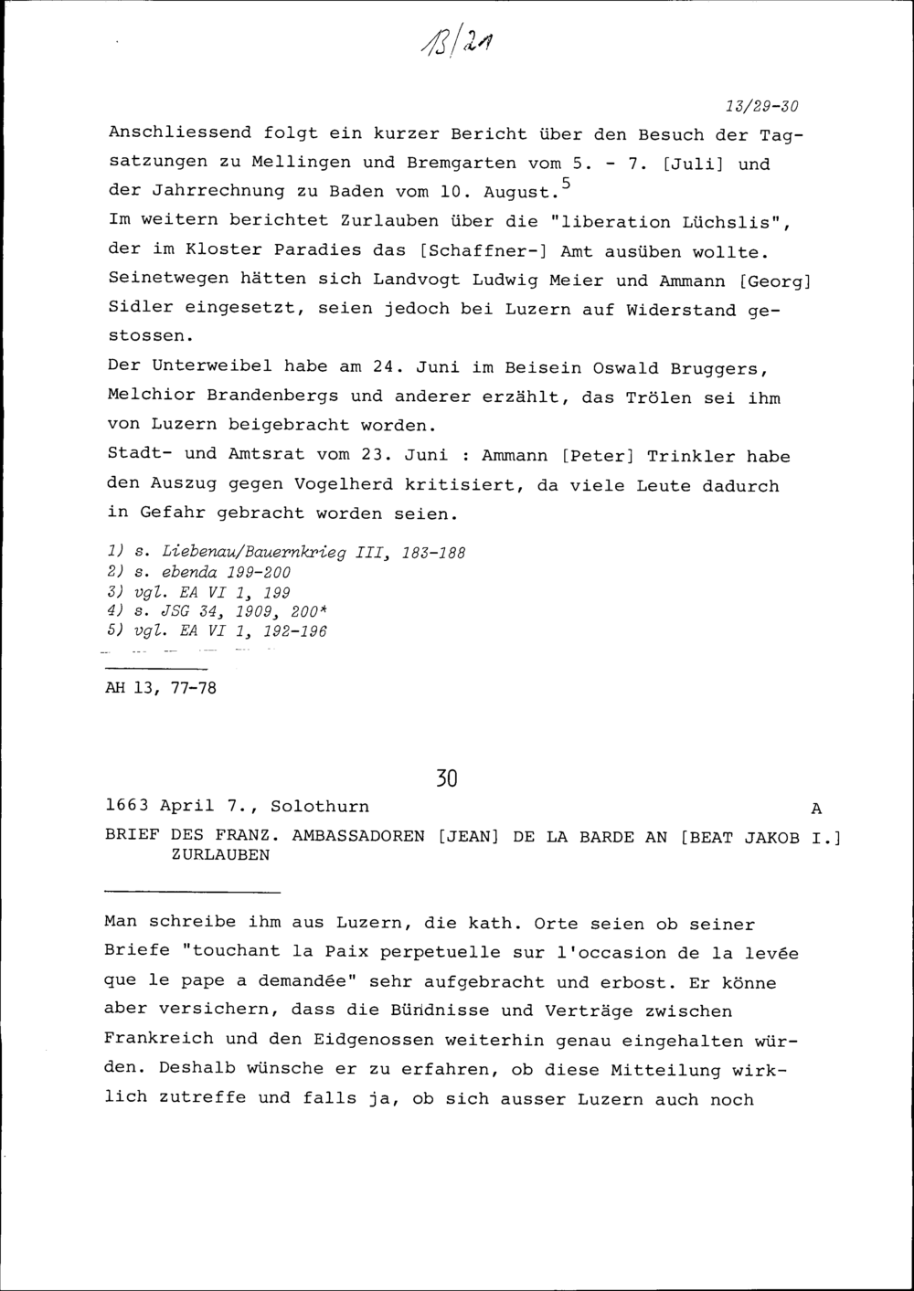 Notiz von Beat II. Zurlauben zum Bauernkrieg
