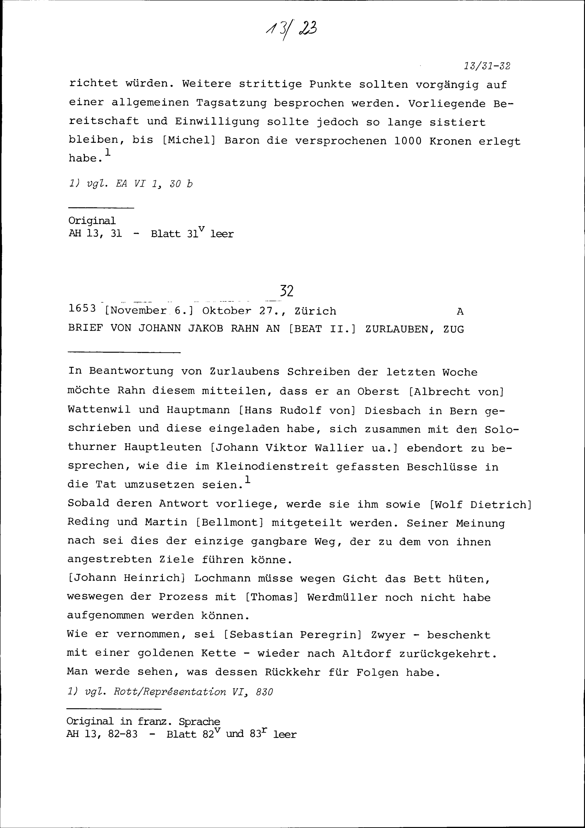 Notiz von Beat II. Zurlauben zur Bündniserneuerung mit Frankreich