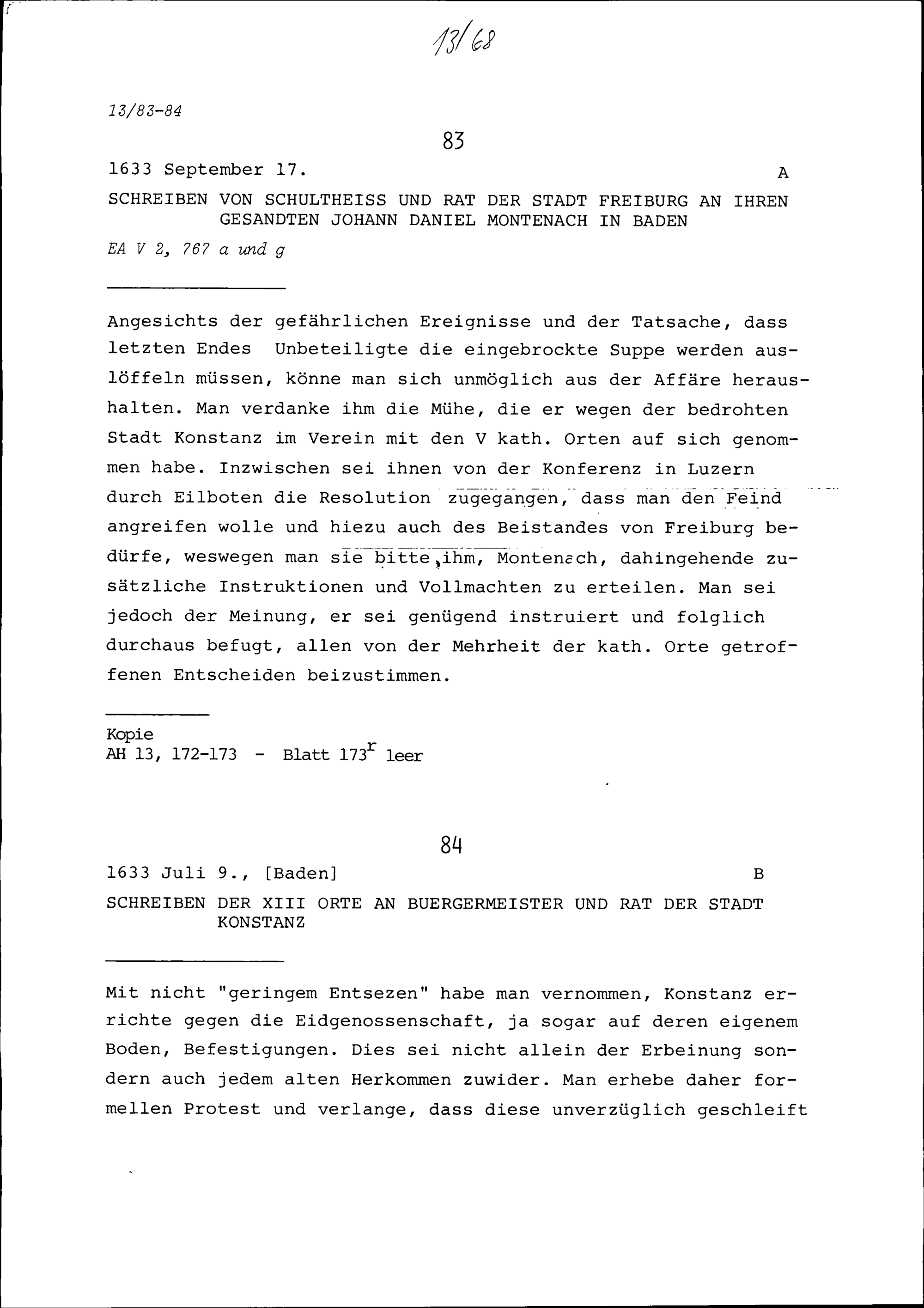Schreiben der Dreizehn Orte an Bürgermeister und Rat der Stadt Konstanz