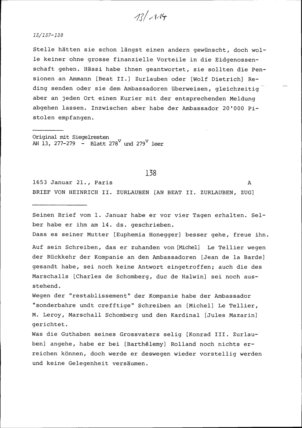 Schreiben von Heinrich II. Zurlauben an Beat II. Zurlauben, Zug