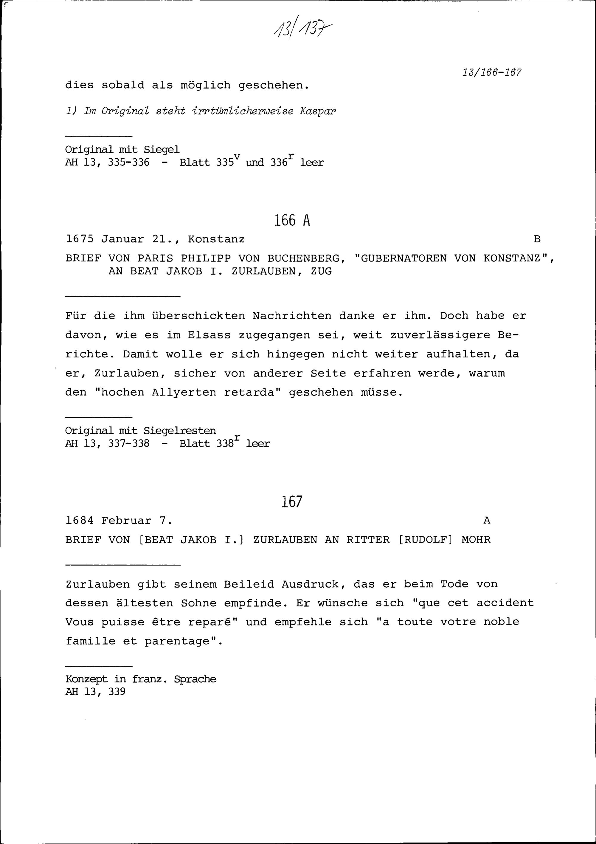 Schreiben von Beat Jakob I. Zurlauben an Rudolf Mohr