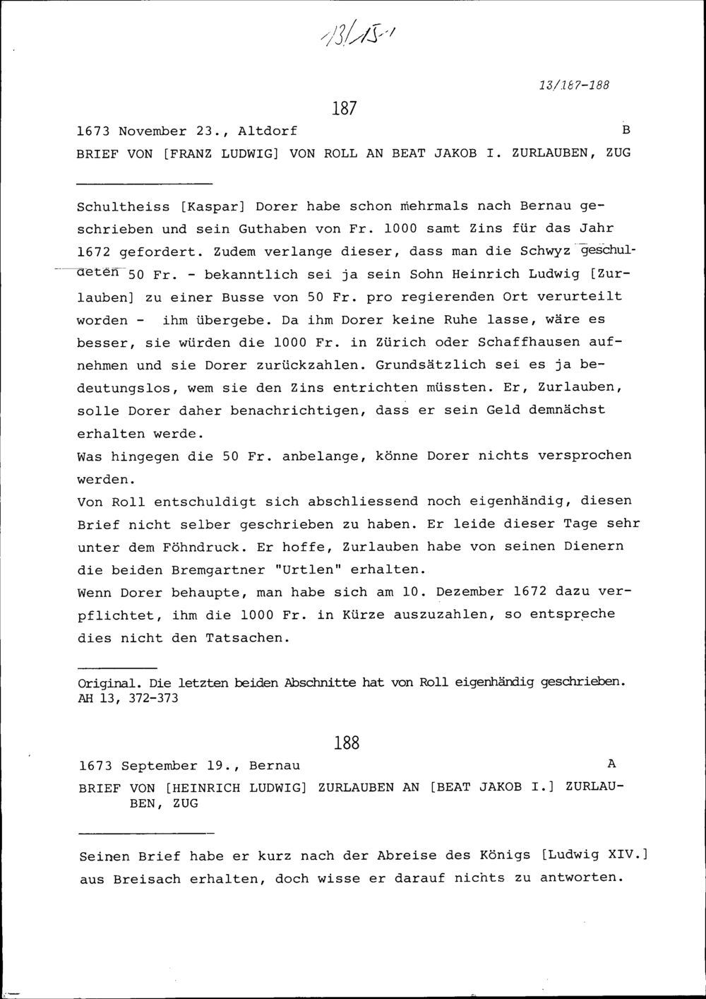 Schreiben von Heinrich Ludwig Zurlauben an Beat Jakob I. Zurlauben, Zug
