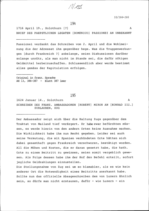 Schreiben von Robert Miron, Ambassador von Frankreich, an Konrad III. Zurlauben, Zug