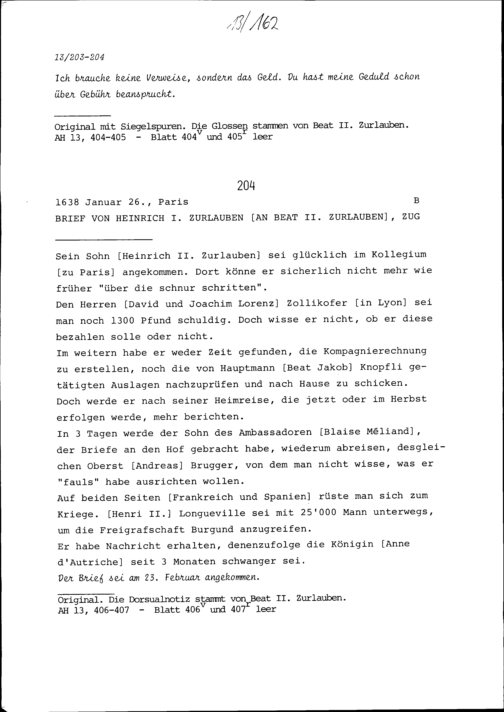 Schreiben von Heinrich I. Zurlauben an Beat II. Zurlauben, Zug