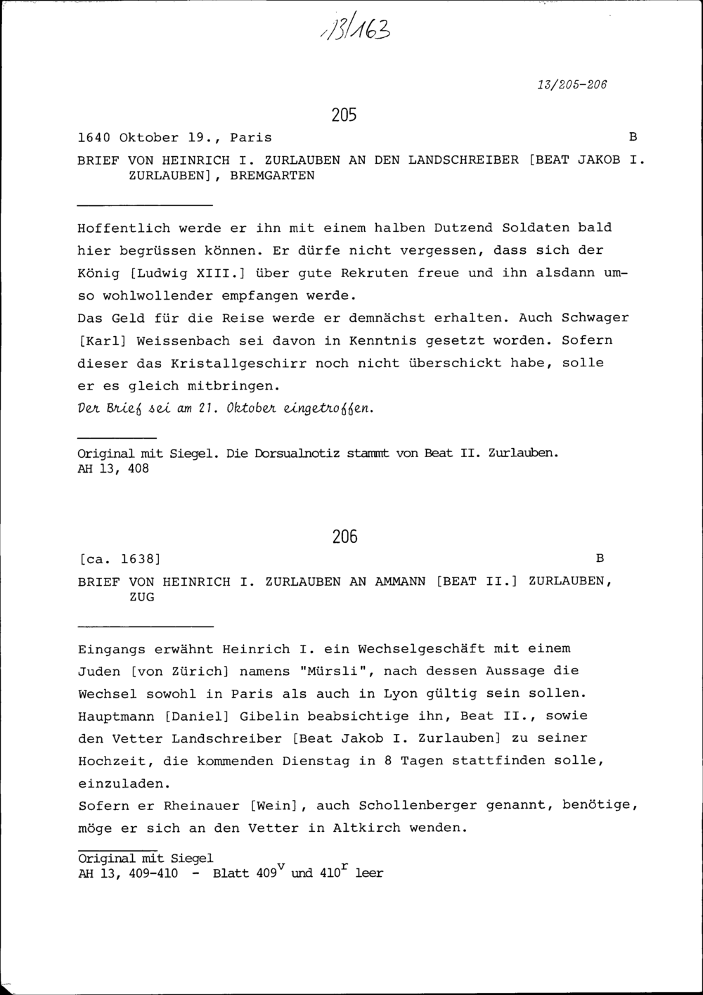 Schreiben von Heinrich I. Zurlauben an Beat II. Zurlauben, Ammann