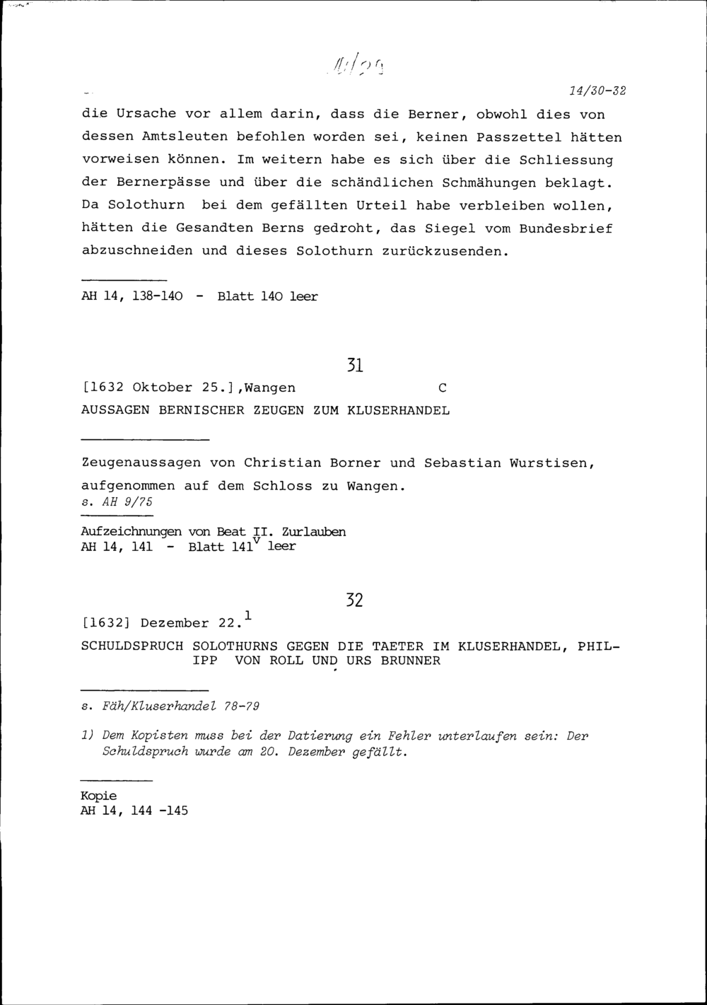 Schuldspruch Solothurns gegen die Täter im Kluserhandel, Philipp von Roll und Urs...