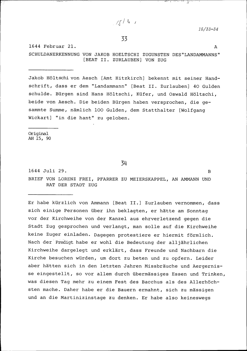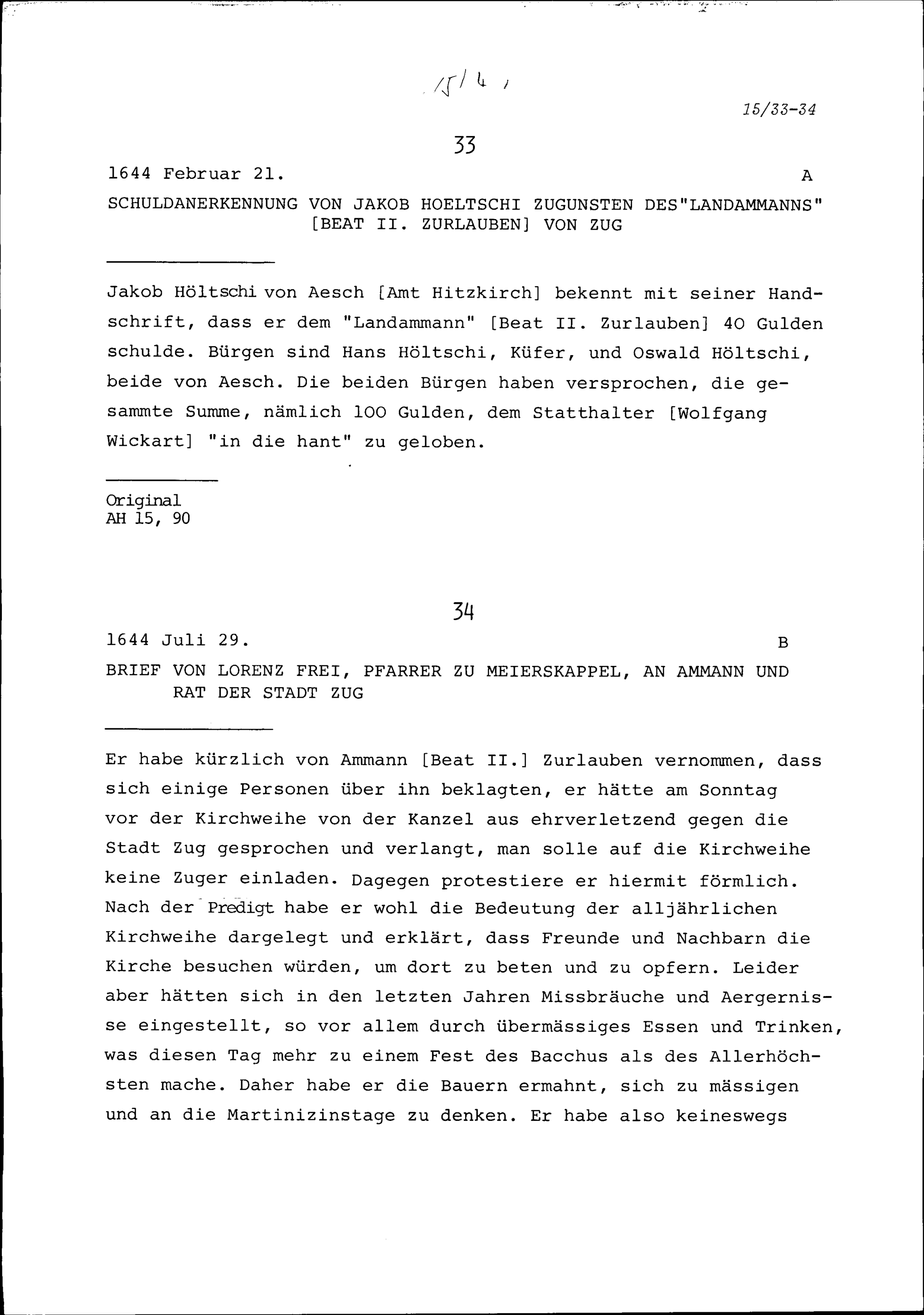 Schreiben von Lorenz Frei, Pfarrer zu Meierskappel, an Ammann und Rat der Stadt Zug