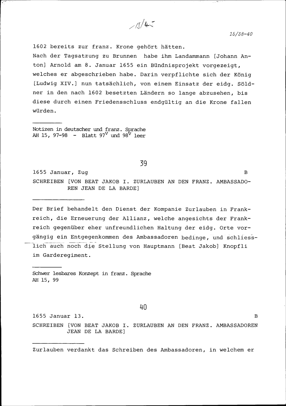 Notiz von Beat II. Zurlauben über die Verhandlungen betreffend die Erneuerung des...