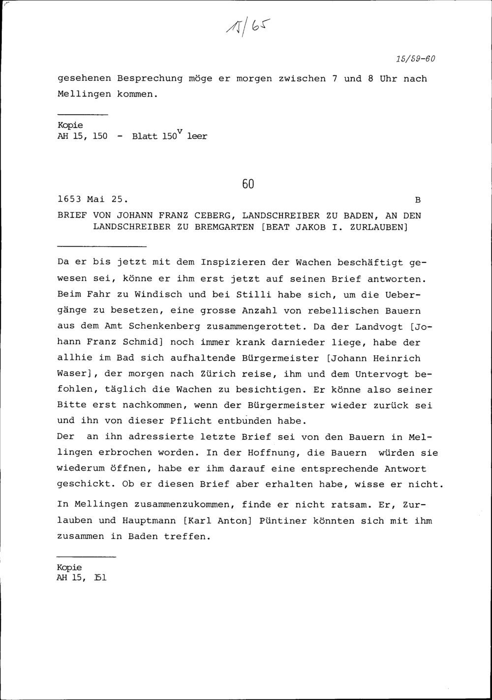 Schreiben von Beat Jakob I. Zurlauben, Landschreiber, an Johann Franz Ceberg, Landschreiber, zu Baden