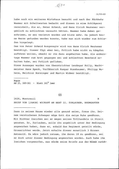 Zeugenaussagen über den Totschlag an Ulrich Wasmer durch Jakob Schmid, im Dienste der Kompanie Zurlauben