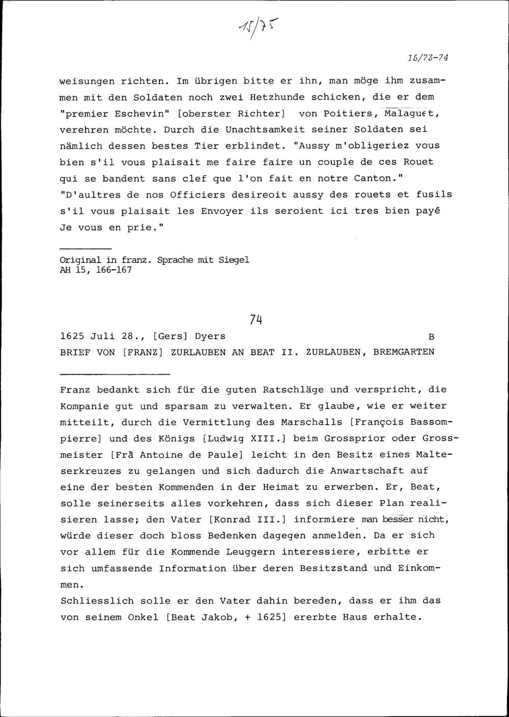 Schreiben von Franz Zurlauben an Beat II. Zurlauben, Bremgarten