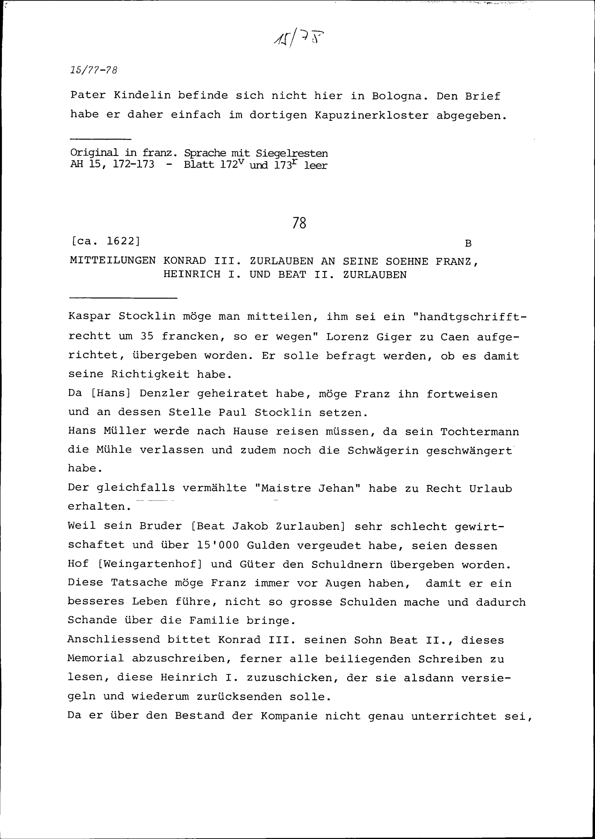 Schreiben von Franz Zurlauben an Konrad III. Zurlauben, Zug