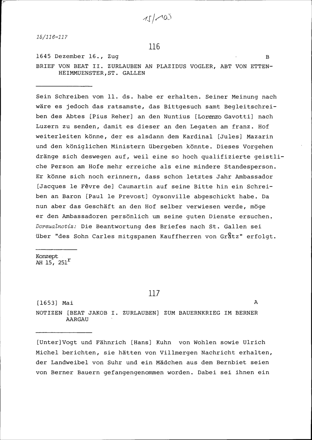 Notiz von Beat Jakob I. Zurlauben zum Bauernkrieg im Berner Aargau