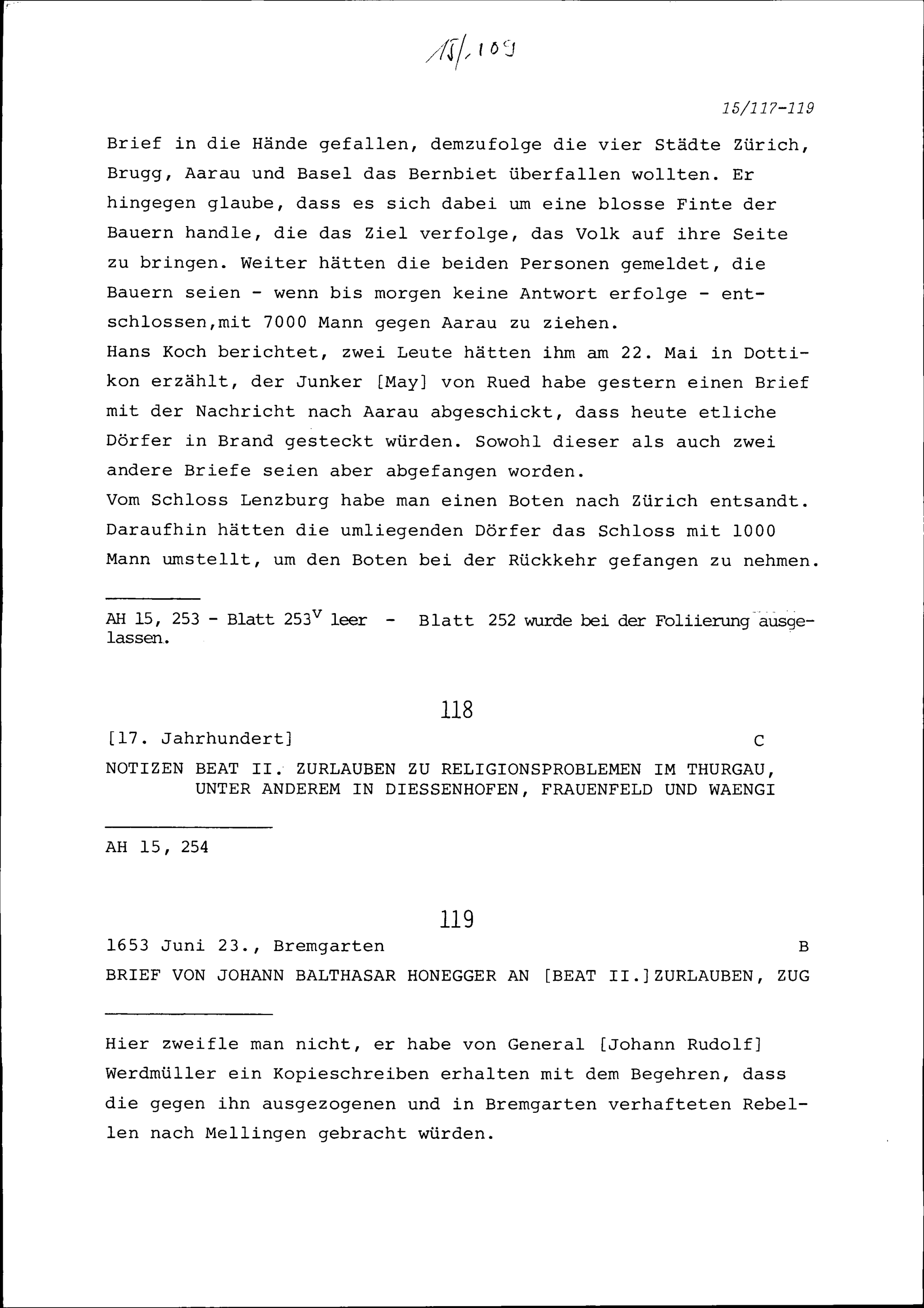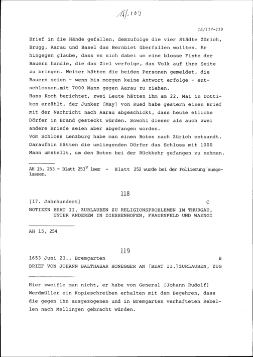 Notiz von Beat Jakob I. Zurlauben zum Bauernkrieg im Berner Aargau