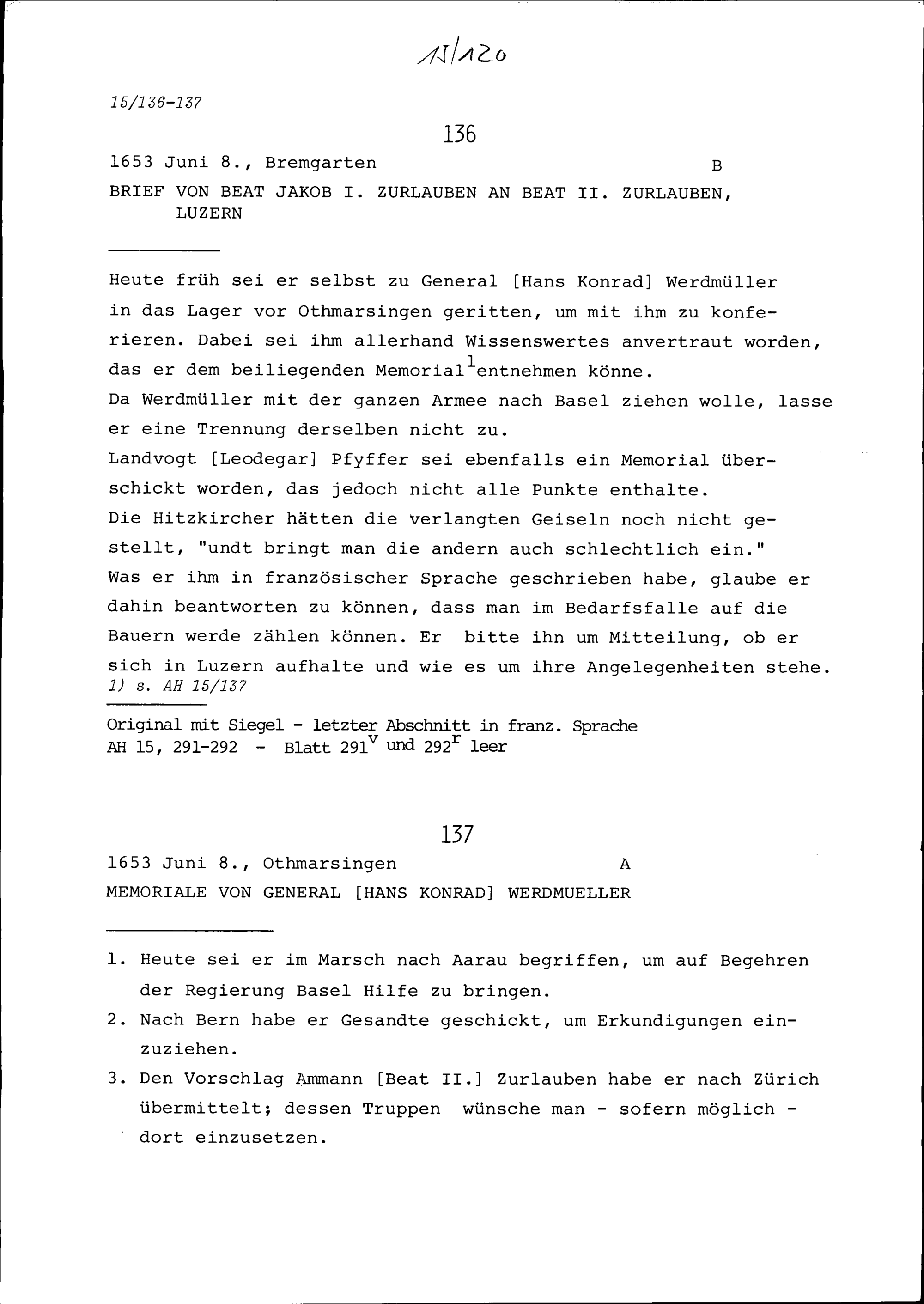 Bericht von Hans Konrad Werdmüller, General,