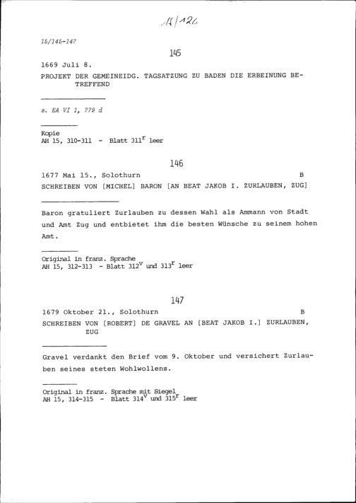 Schreiben von Robert de Gravel an Beat Jakob I. Zurlauben, Zug