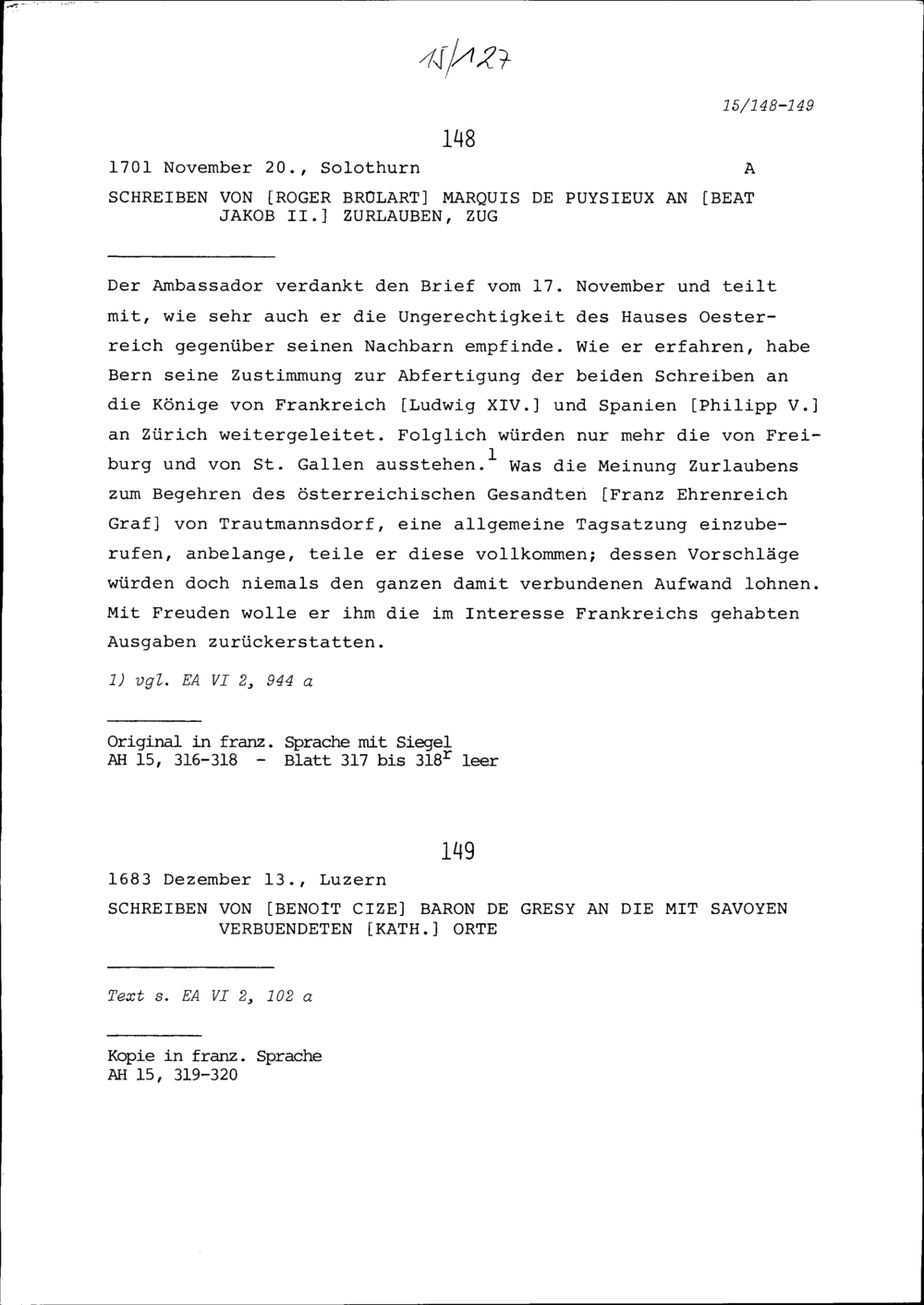 Schreiben von Benoît II. Cize, Baron de Grésy an die mit Savoyen verbündeten Katholischen Orte