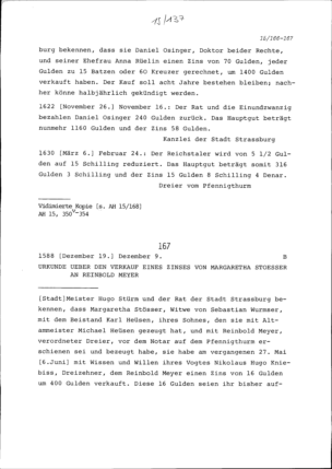 Urkunde über den Verkauf eines Zinses der Stadt Strassburg an Daniel Osinger, Dr.,...