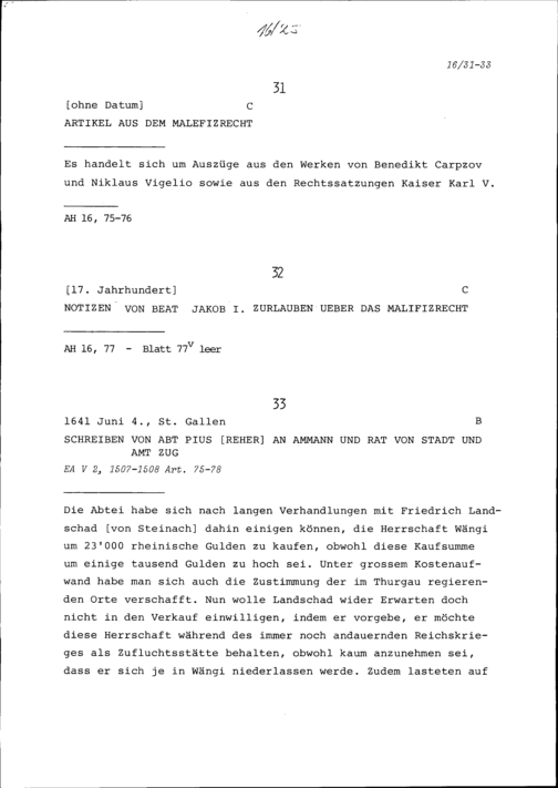 Notiz von Beat Jakob I. Zurlauben über das Malefizrecht