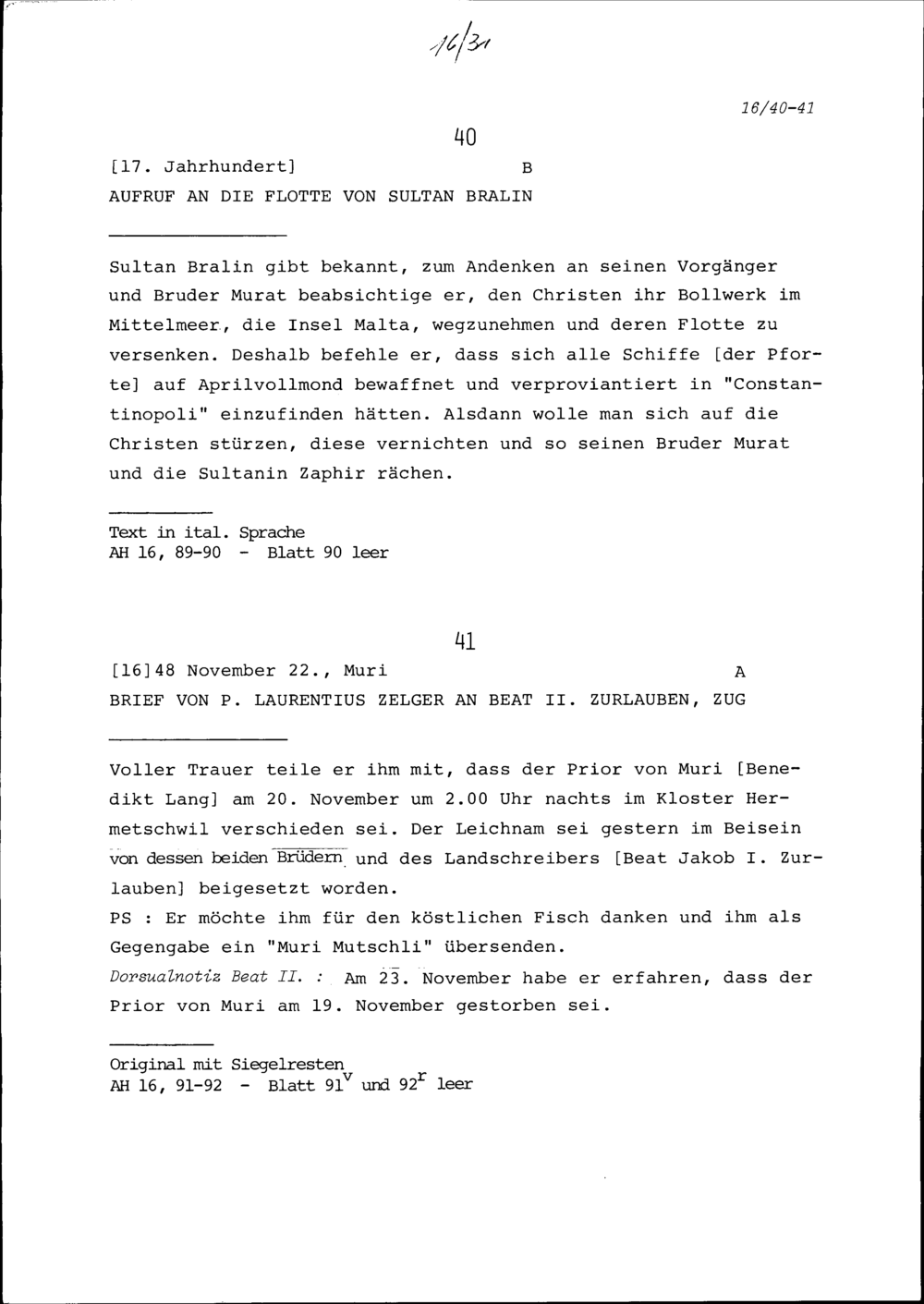 Schreiben von Laurentius Zelger, Konventuale, an Beat II. Zurlauben, Zug