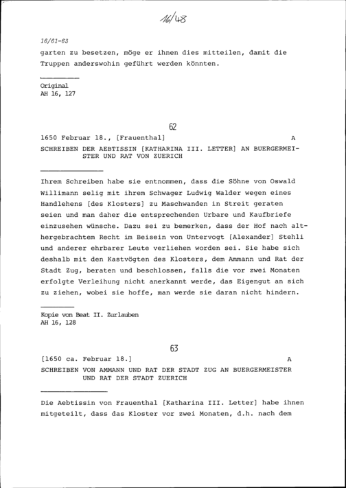 Schreiben des Ammanns und Rats der Stadt Zug an Bürgermeister und Rat der Stadt ...