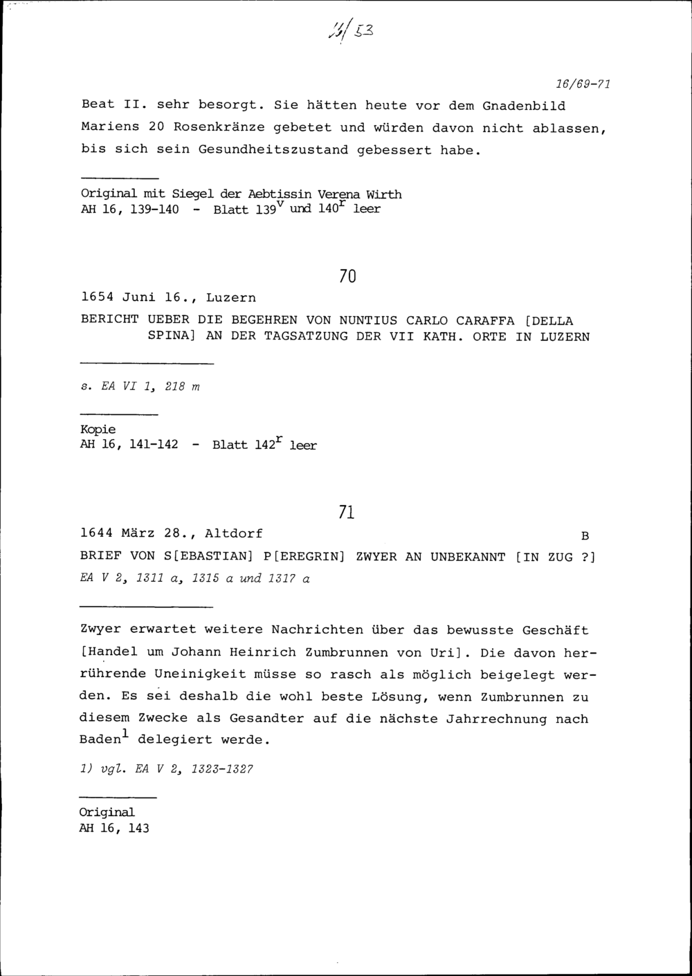 Schreiben von Sebastian Peregrin Zwyer an Unbekannt in Zug