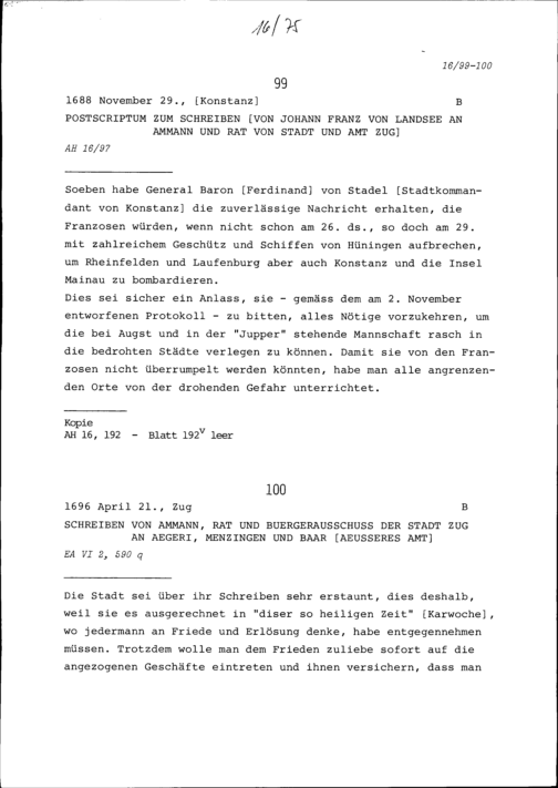 Schreiben von Ammann, Rat und Bürgerausschuss der Stadt Zug an Ägeri, Menzingen und...