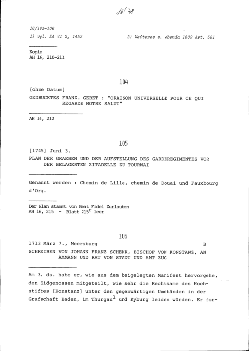 Schreiben von Johann Franz Schenk, Bischof von Konstanz, an Ammann und Rat von Stadt und Amt Zug