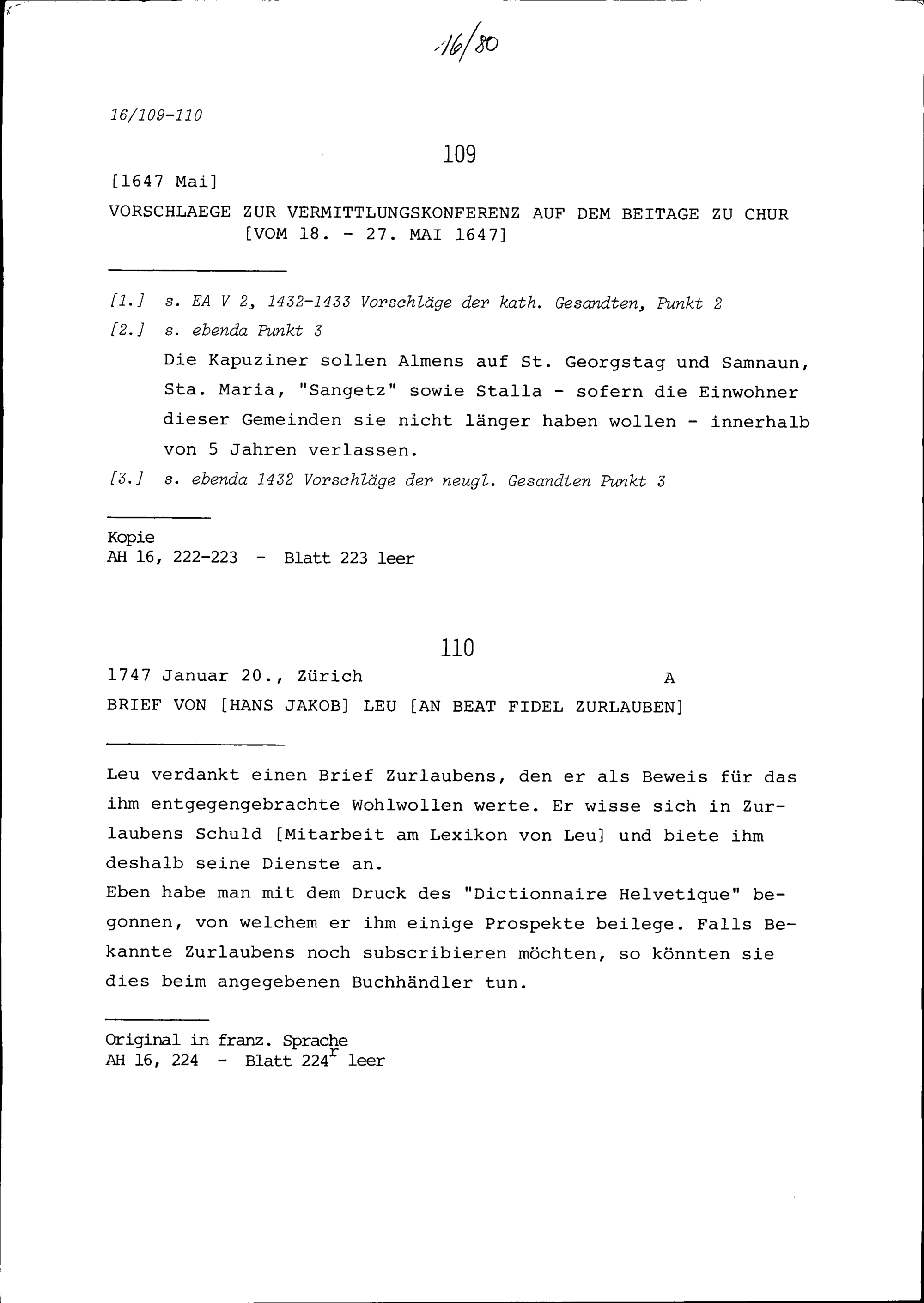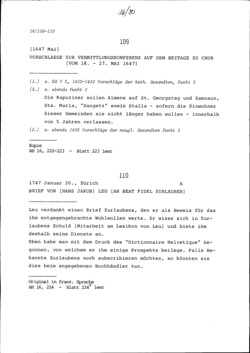 Schreiben von Hans Jakob Leu an Beat Fidel Zurlauben
