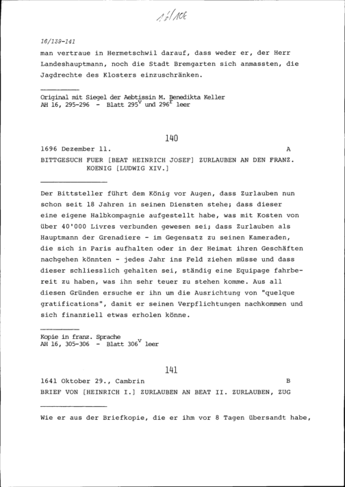 Schreiben von Maria Franziska Müöslin, Klosterfrau, an Beat Jakob I. Zurlauben, Bremgarten
