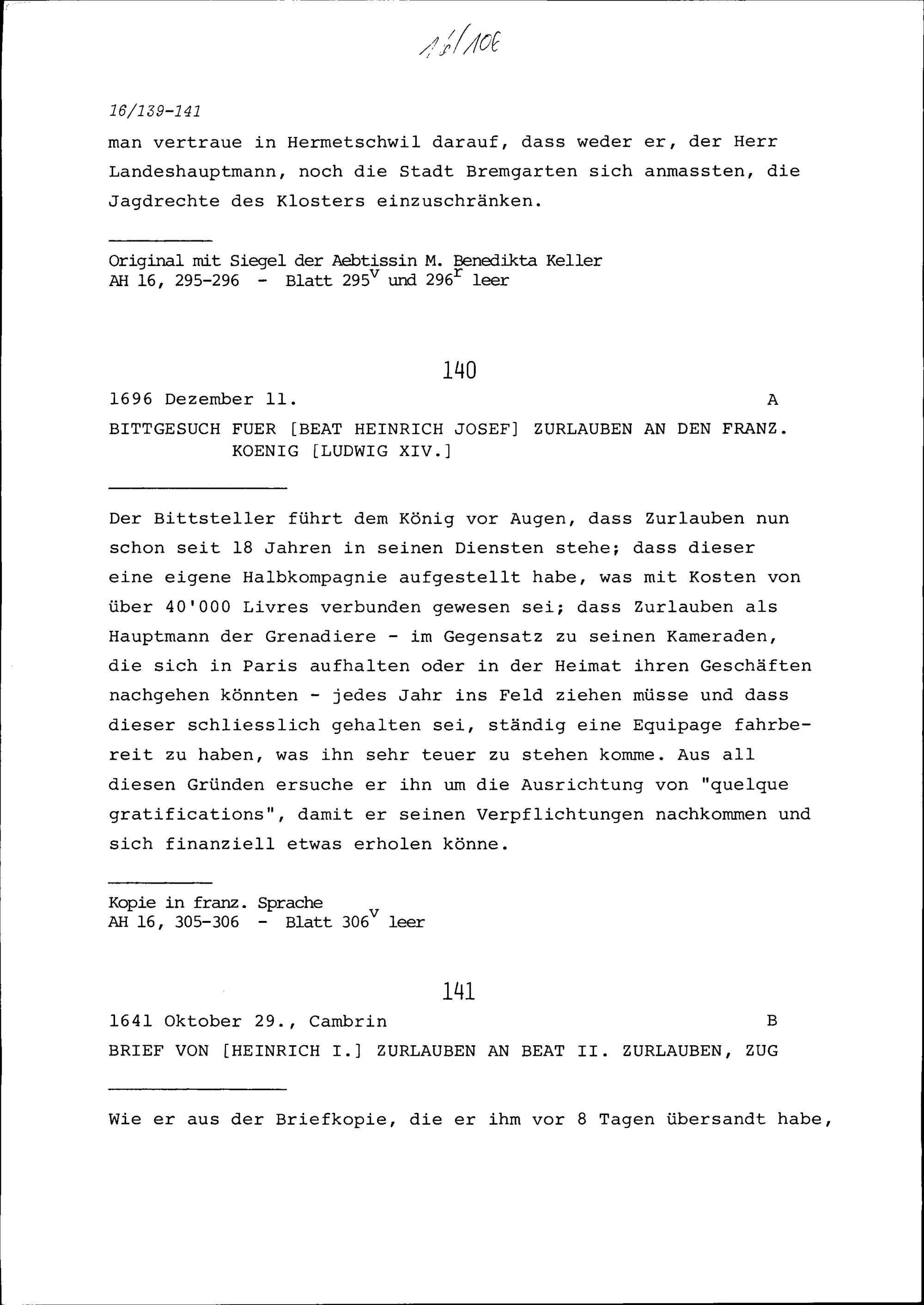 Schreiben von Heinrich I. Zurlauben an Beat II. Zurlauben, Zug