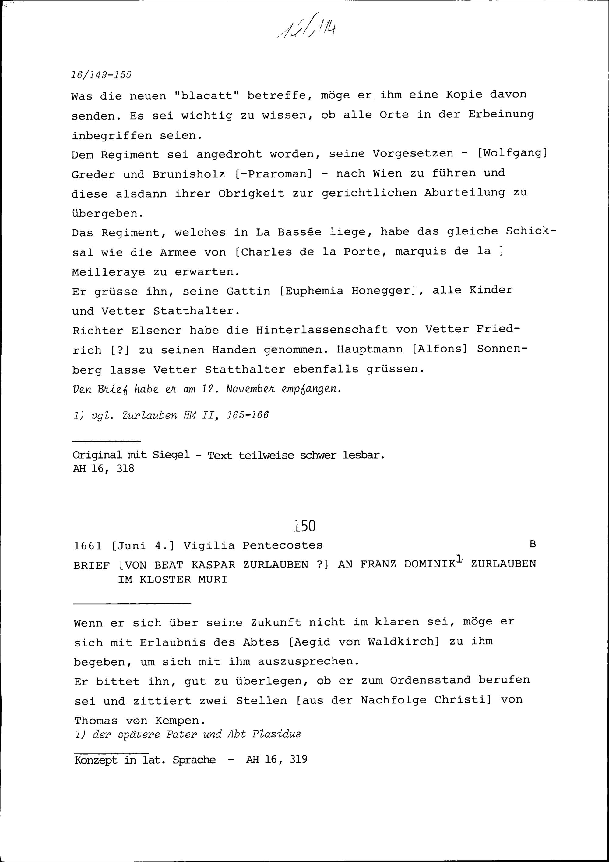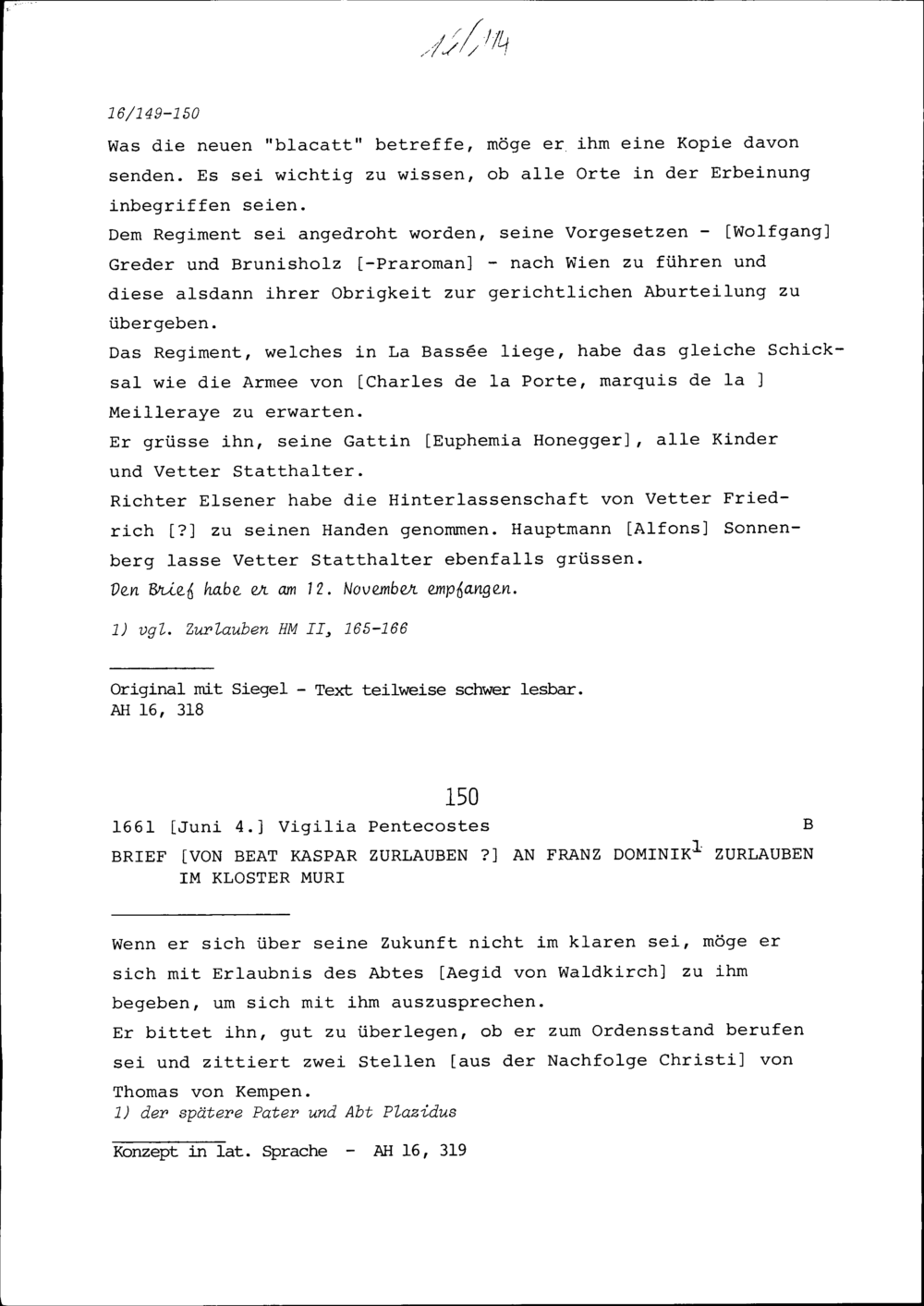 Schreiben von Heinrich I. Zurlauben an Beat II. Zurlauben, Zug