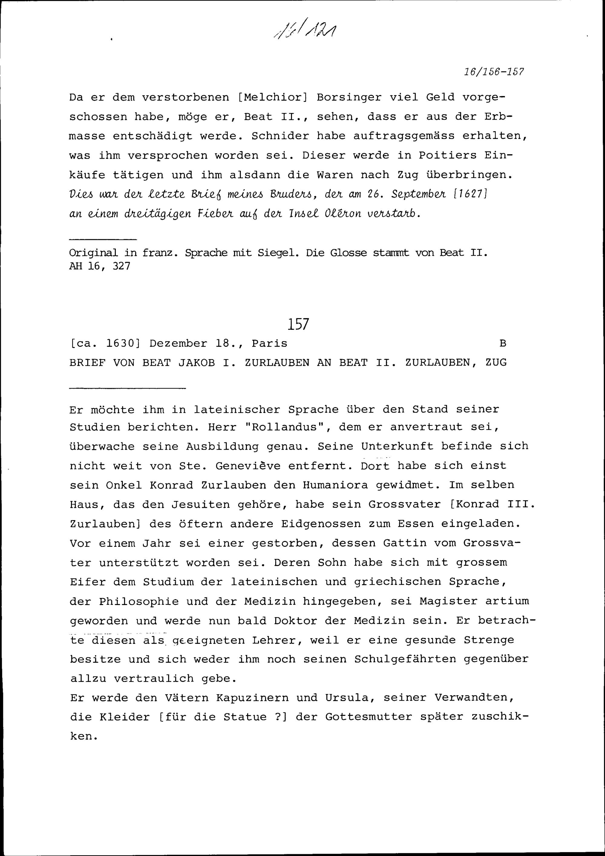 Schreiben von Franz Zurlauben an Beat II. Zurlauben, Bremgarten