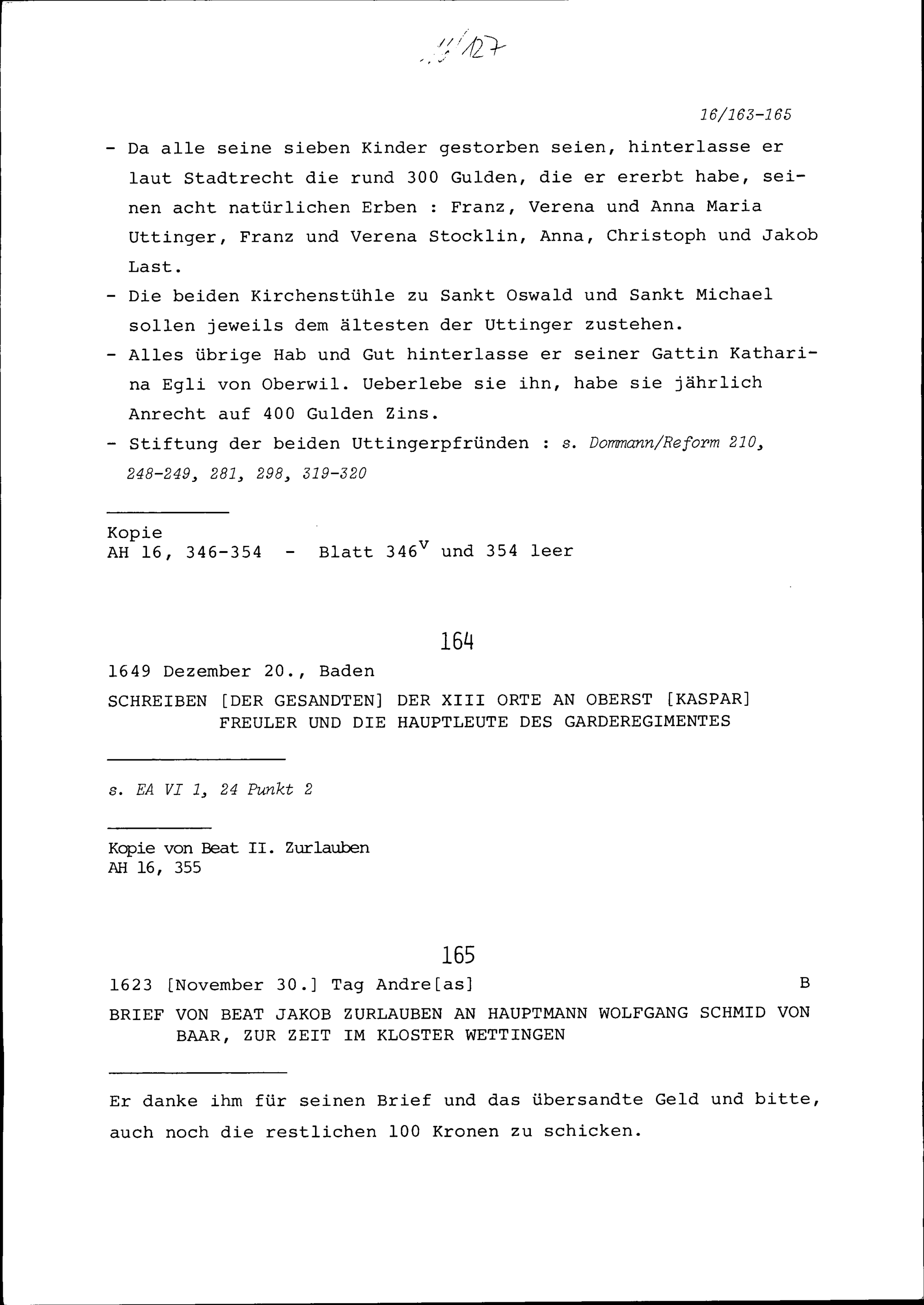 Schreiben von Beat Jakob Zurlauben an Wolfgang Schmid von Baar, Hauptmann, zur Zeit im Kloster Wettingen