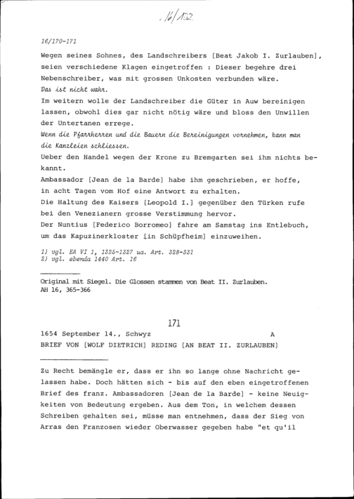 Schreiben von Kaspar Pfyffer an Beat II. Zurlauben, Zug