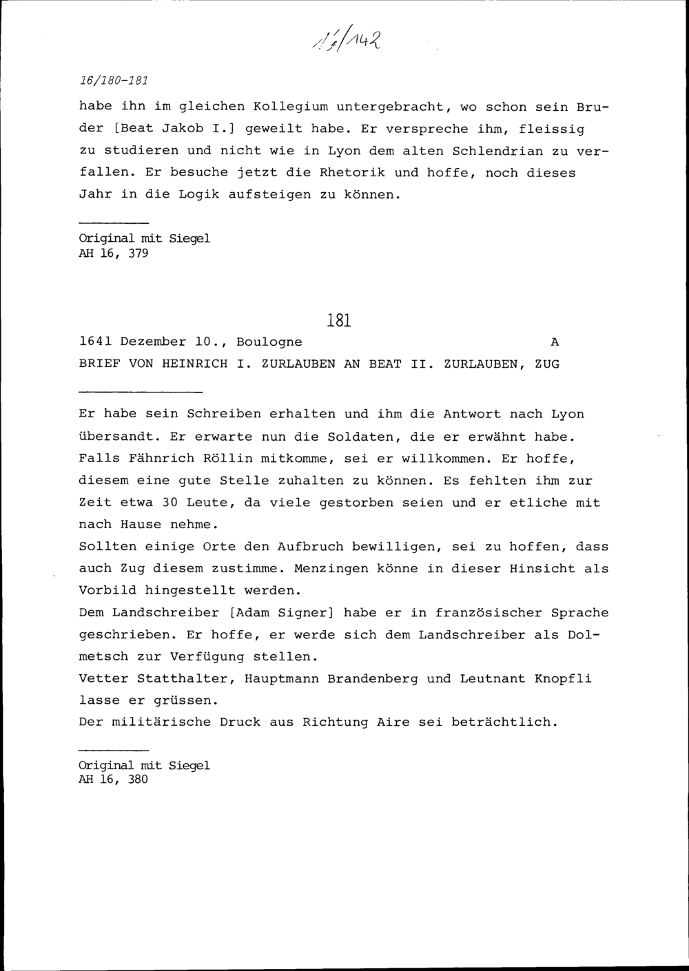 Schreiben von Heinrich II. Zurlauben an Beat II. Zurlauben, Zug