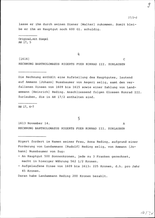 Rechnung von Bartholomäus Rigert für Konrad III. Zurlauben