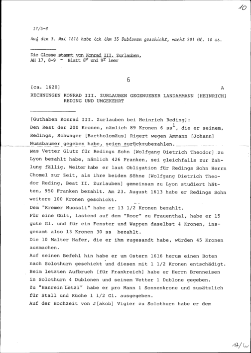 Rechnung von Bartholomäus Rigert für Konrad III. Zurlauben