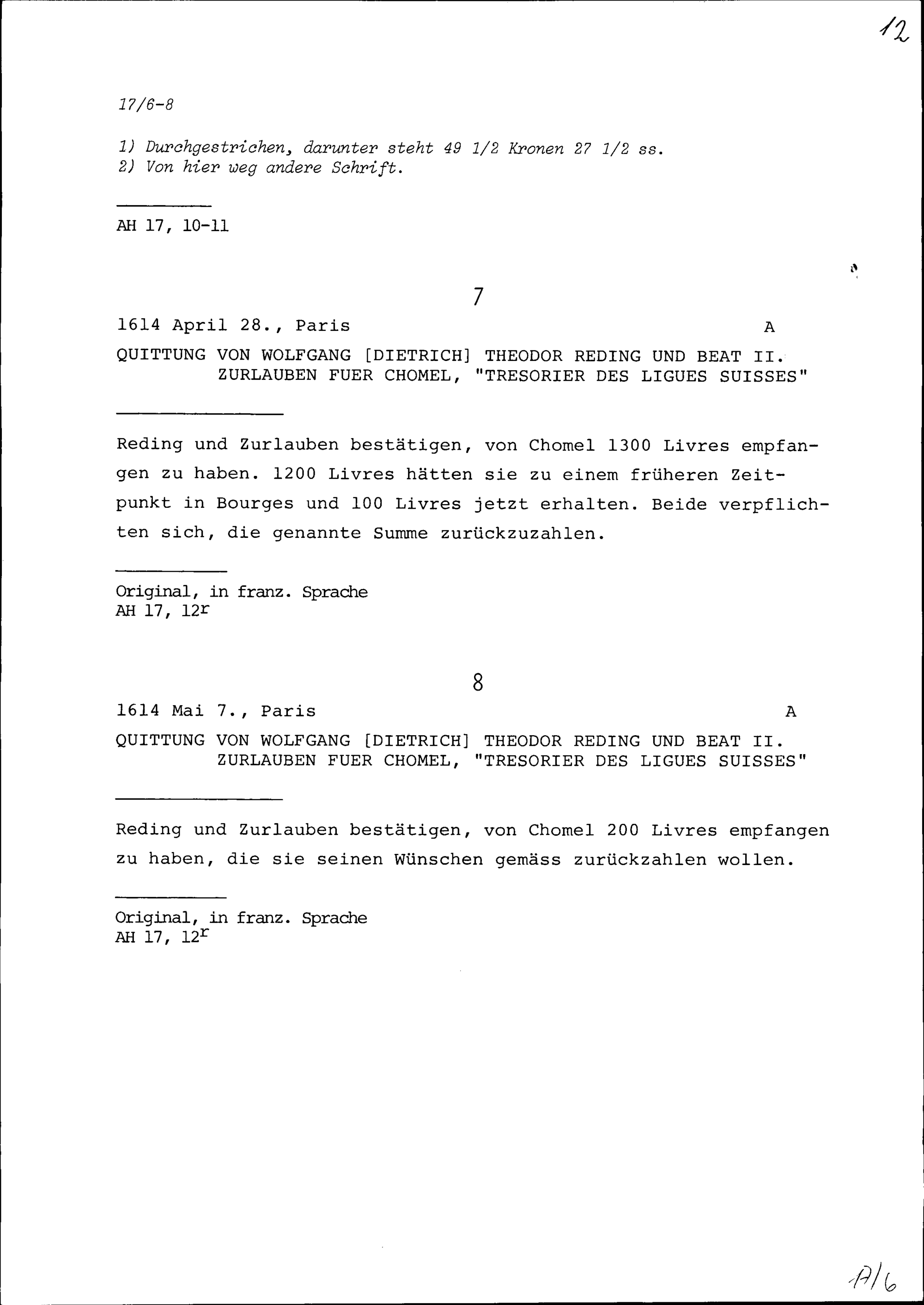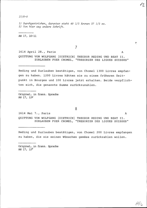 Rechnungen von Konrad III. Zurlauben gegenüber Heinrich Reding, Landammann, und ...