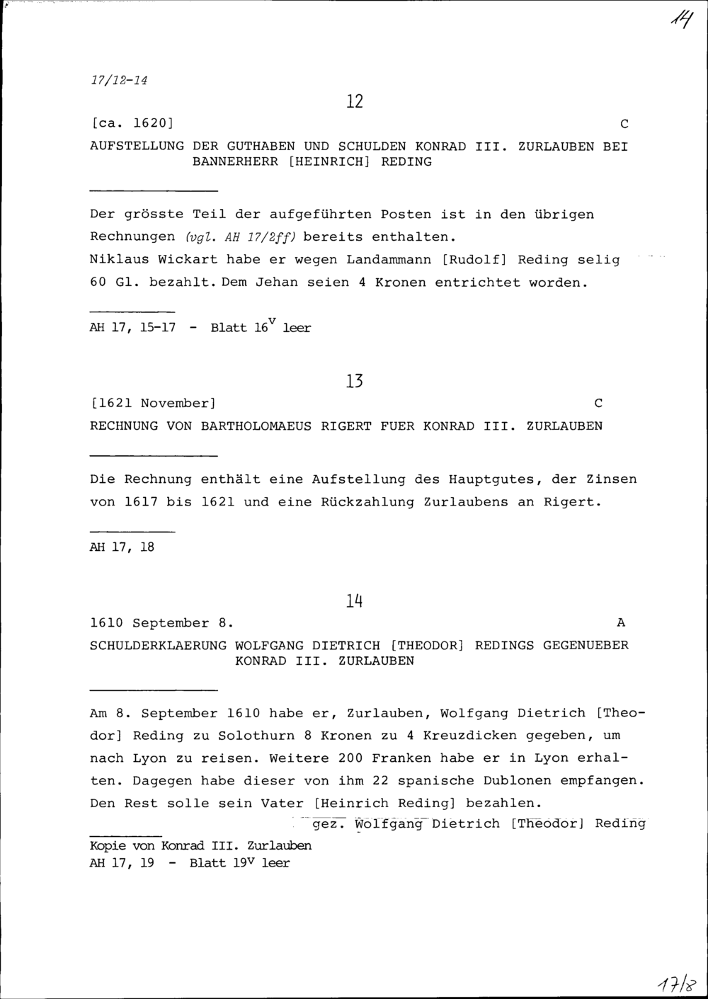 Schulderklärung von Wolfgang Dietrich Theodor Reding gegenüber Konrad III. Zurla...